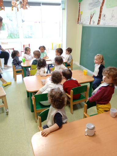 Chez les bébés , les repas sont donnés individuellement .Quand les enfants gagnent en autonomie ,des petites tablées de 2,3 ou 4 sont proposées.